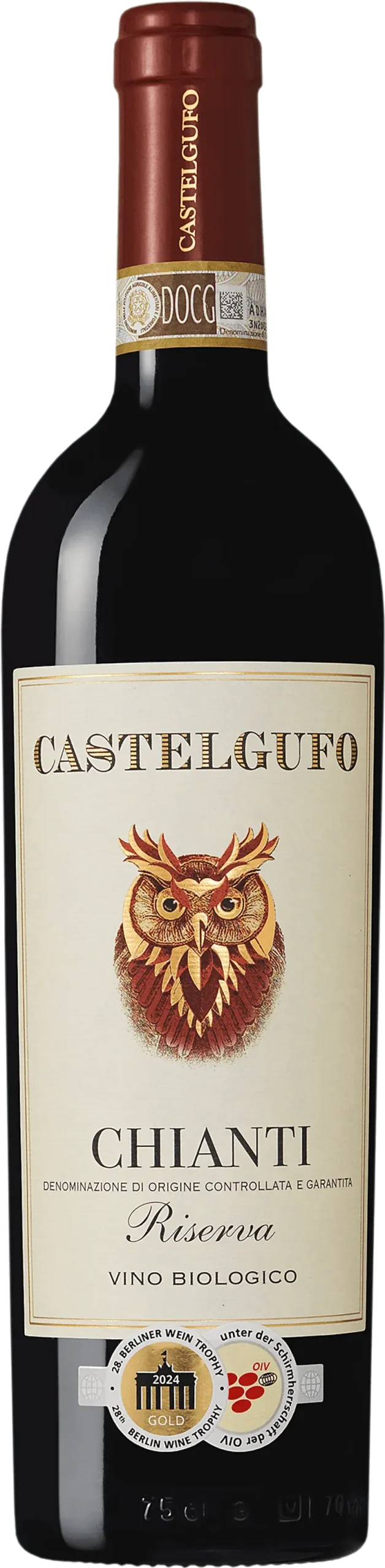Castelgufo Chianti Riserva Organic is an organic wine from Tuscany, Italy, made from Sangiovese grapes. It offers a full-bodied, spicy profile with clear oak character and notes of dark cherries, plums, cocoa, nuts, black tea, and herbs. Subtle roasted tones from the barrels add depth and structure.